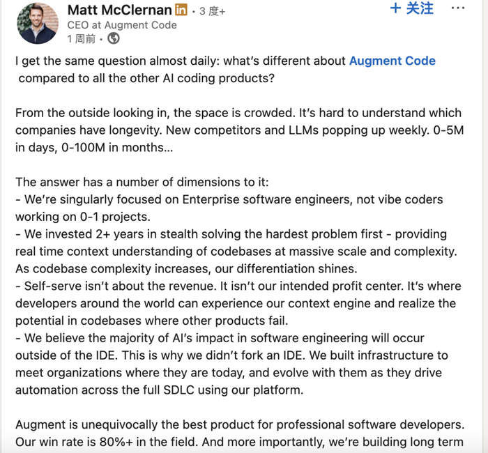 在确定定价变更的几天后,McClernan 在领英上发帖称,这个领域竞争非常激烈,但 Augment 在市场中的赢单率超过 80%。